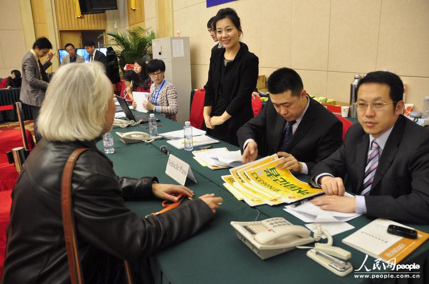 人民網北京3月1日電(記者趙晶)1日下午,記者來到位于梅地亞中心的2013年兩會新聞中心,工作人員在為參會記者辦理證件領取工作。