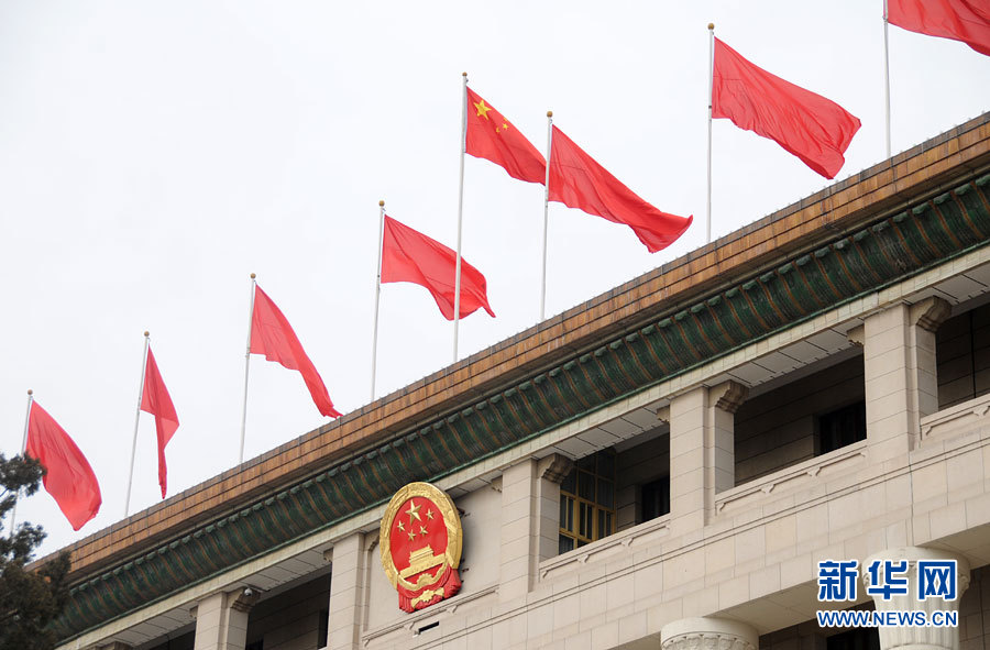 3月2日,人民大會堂上方布置的紅旗迎風(fēng)飄揚(yáng),喜迎2013年全國兩會的召開。新華網(wǎng) 翟子赫攝