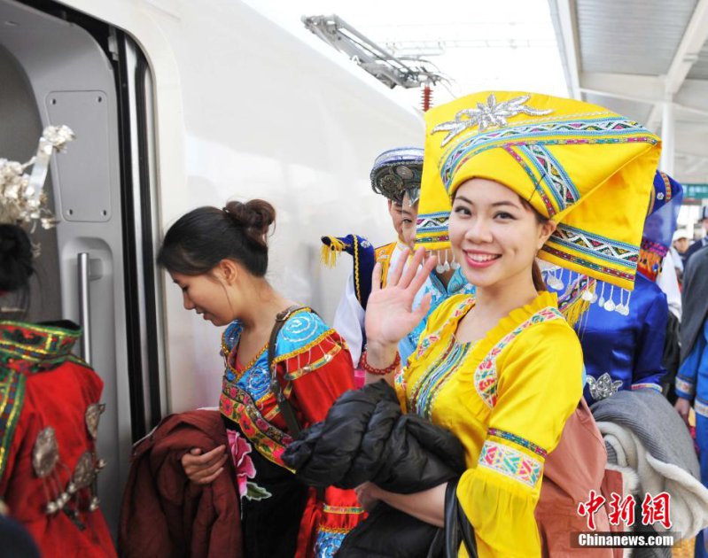 12月30日,廣西壯族自治區首府南寧市成為中國第一個開通高鐵的自治區首府。當日,南寧至桂林、南寧至防城港開行動車組。廣西12個少數民族姑娘結伴體驗高鐵。廣西區內聚居著壯、漢、瑤、苗、侗等12個民族。中新社發 蔣雪林 攝