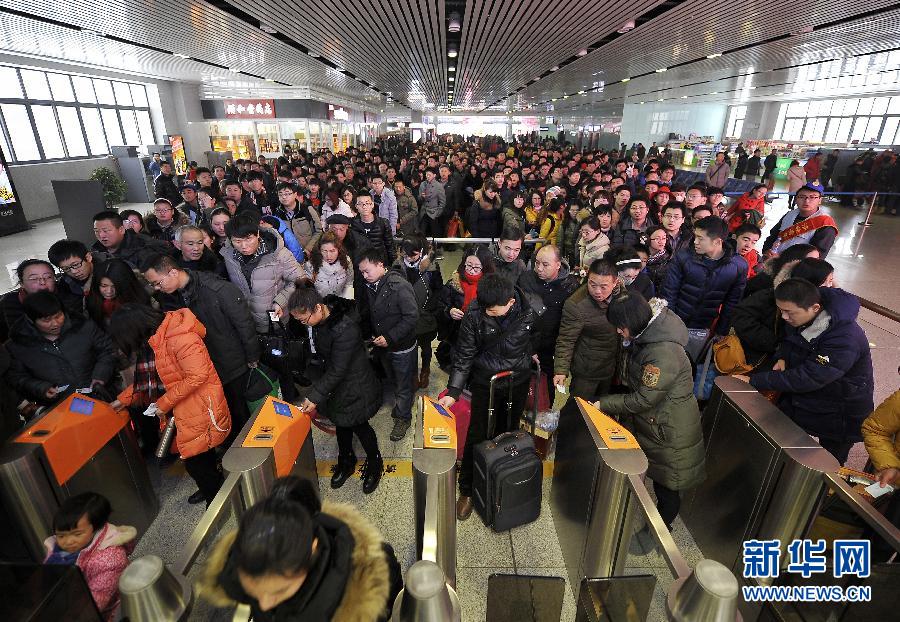 2月6日,旅客在山東濟南火車站進站乘車。當日是春節長假的最后一天,各地迎來春運返程客流高峰。 新華社發(唐磊 攝)