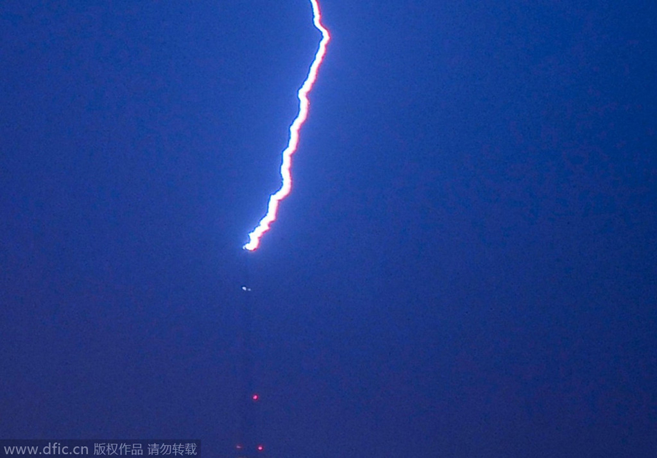 2014年8月11日午夜,雷陣雨突襲青島,一道巨型閃電擊中電視發射塔,雷聲震耳欲聾。