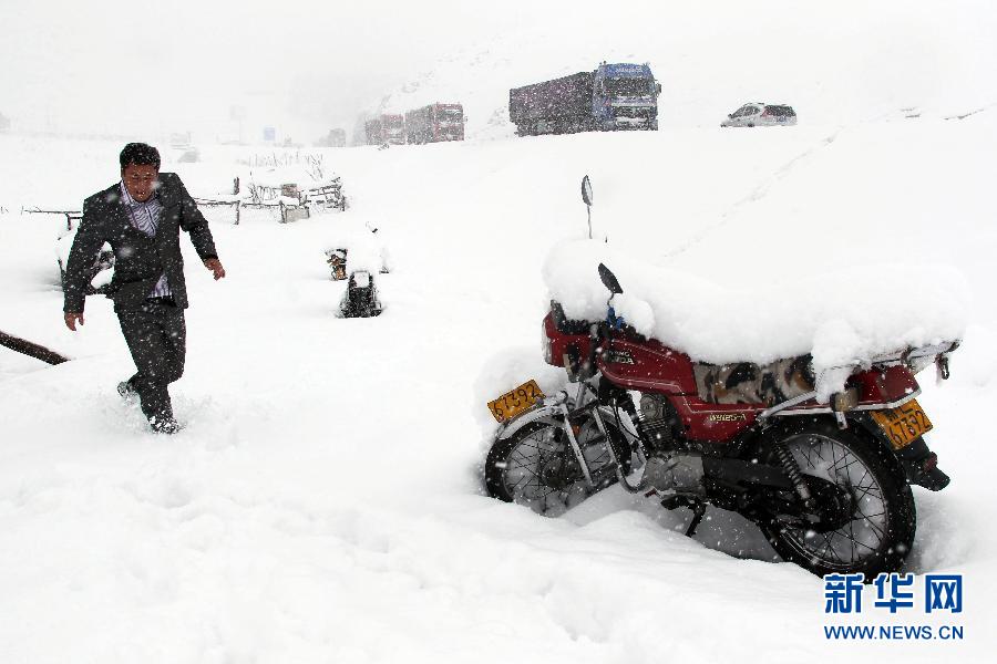 9月12日,車輛在新疆哈密降雪路段緩慢行駛。受冷空氣影響,新疆哈密地區(qū)當(dāng)日降下了金秋首場大雪,給當(dāng)?shù)剞r(nóng)牧業(yè)和交通帶來了不同程度的影響。 新華社發(fā)(普拉提 攝)