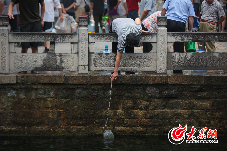 6月15日,濟(jì)南黑虎泉畔,一位市民在泉池邊打水。當(dāng)日,濟(jì)南七十二名泉之一的黑虎泉三只獸首全部斷流停噴。大眾網(wǎng)記者 王長(zhǎng)坤 攝