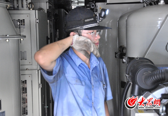 “90后”劉富強告訴大眾網記者,機車剛回段里時,機械間溫度有47攝氏度左右,一進去汗“唰”就下來了。(記者 王宗陽 攝)