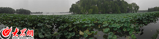 連日來,小雨降臨泉城,雨滴打在荷葉上,給了大明湖一種別樣的美。 (見習記者 孫博洋 攝)
