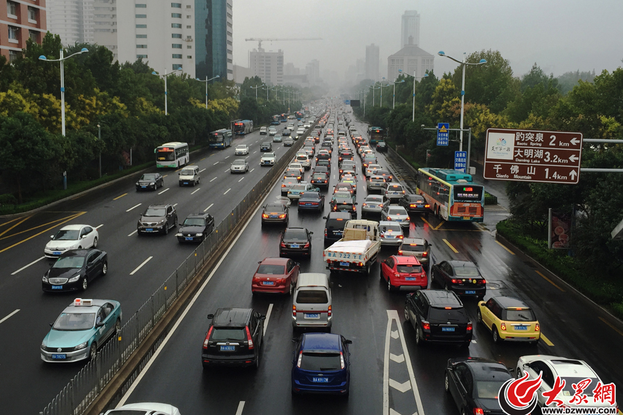 因為一場降雨,今早濟南交通擁擠,圖為經十路的交通狀況。(見習記者 孫博洋 攝)