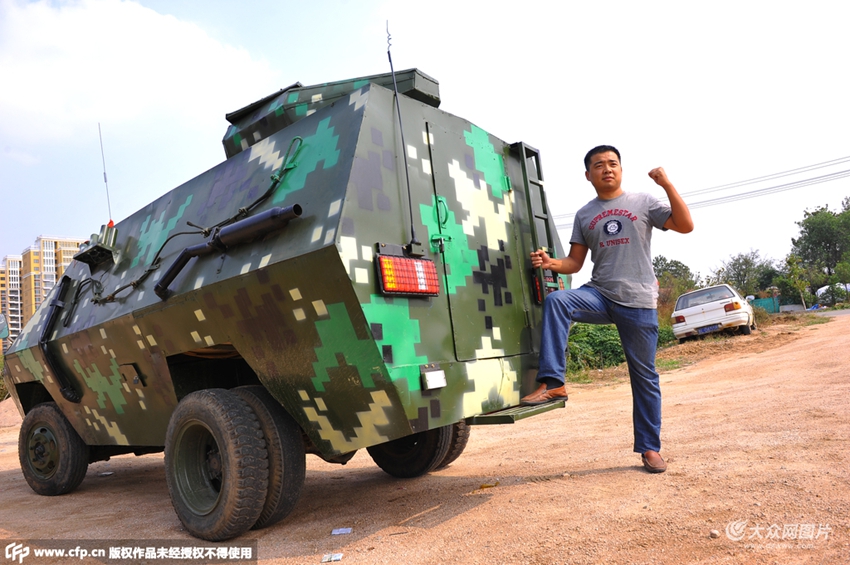 2015年10月8日,山東省日照市經濟技術開區北京路街道前崮子村,80后青年時延強在整修他歷時7個月打造的輪式“裝甲車”。