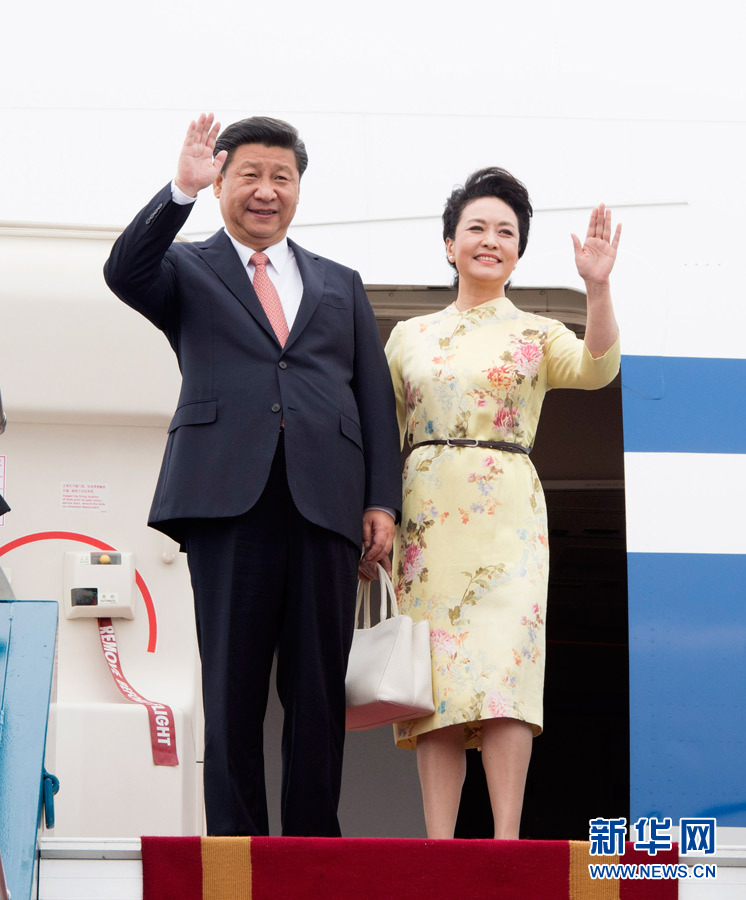 11月5日,中共中央總書記、國家主席習近平抵達越南首都河內,開始對越南進行國事訪問。這是習近平和夫人彭麗媛步出艙門向歡迎人群揮手致意。新華社記者 李學仁 攝