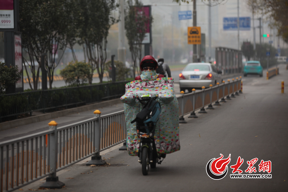 11月10日,濟南濼源大街,市民在霧霾中騎行。當日,濟南迎來大霧天氣,整座城市被霧霾籠罩,空氣相對濕度大于90%,能見度較低;不止是濟南,今天山東全省都遭遇了霧霾天氣。大眾網記者 王長坤 攝