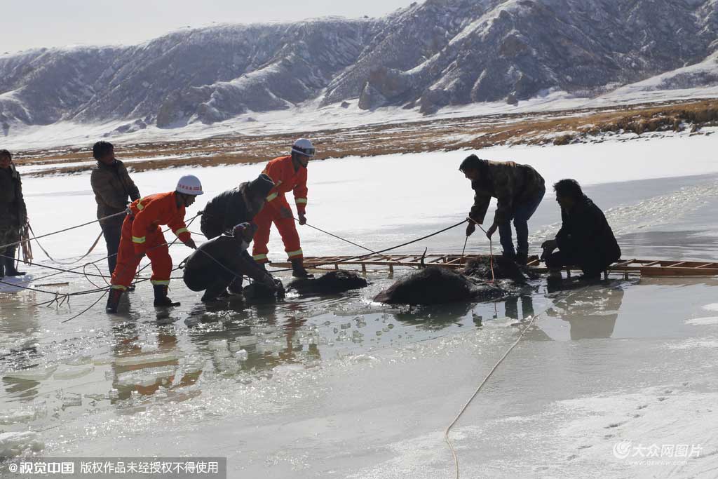 經歷了2個多小時的冰河鏖戰,22只牦牛被打撈上岸。