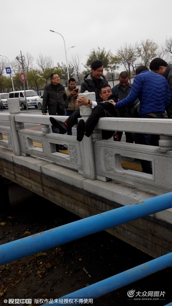 2015年11月23日,近日,在山東淄博周村區(qū),一名新郎被人用膠帶捆在橋上,并且屁股上掛上燃放的鞭炮,吸引眾多路人駐足觀望。