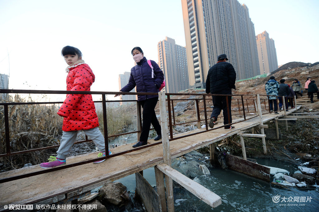 2015年12月15日,山東濟南,槐蔭區某兩個小區之間的河道上建有一座小木板橋,河岸上有人工鑿出的小坑充當臺階,數百學生每天來往于這座小橋上學。