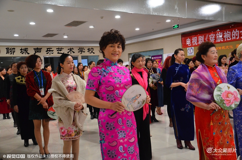 2015年12月16日,山東聊城某商場內(nèi),不少身著靚麗旗袍的阿姨參加培訓(xùn)。