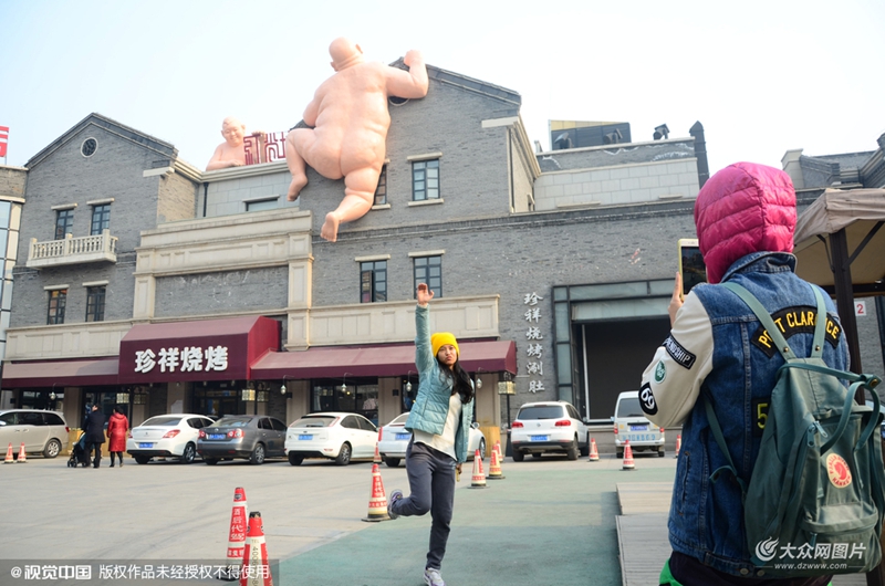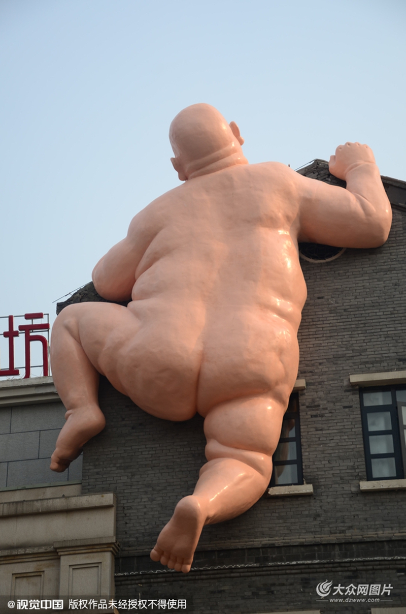 18日下午,網友@濟南同城會發微博:“18日中午,在歷下區泉城路紅尚坊院內,兩個雕塑趴在房頂,吸引了不少路人圍觀。眼尖的路人認出,去年年初在同一地點,也上演過同樣的一幕,據稱這是‘快樂的胖子2.0版’,快去圍觀。”在微信朋友圈里,記者發現也有部分好友上傳了這對雕塑的照片。從網友提供的照片中記者發現,這對雕塑是兩個沒穿衣服的小頑童一個趴在房頂上,一個攀爬在墻頭,由于顏色為肉粉色,在寒冷的冬季甚是惹人眼球。