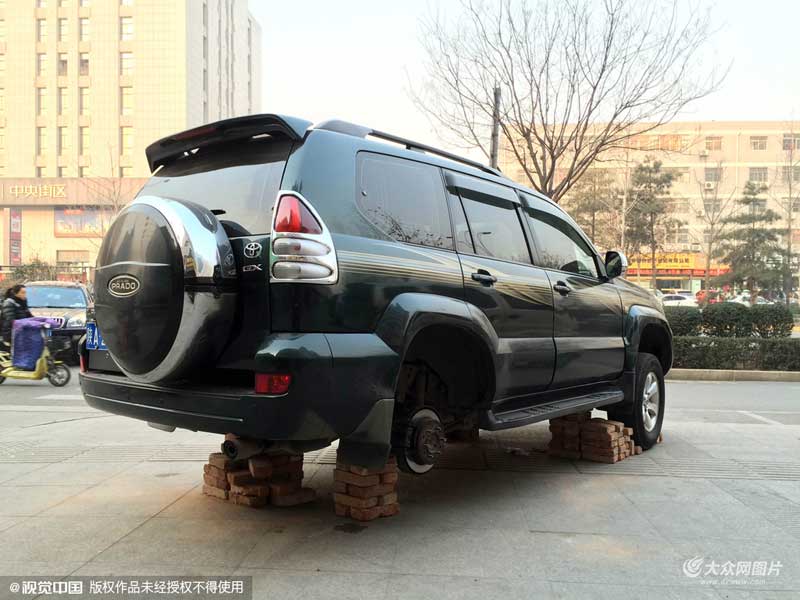 討要借款卻聯系不上借錢人,街頭發現借錢人豐田霸道車后,債主連續盯了幾天,后又卸掉霸道車3個車輪4天后,借錢人還是沒露面。1月28日上午,這輛被卸掉3個輪子用磚頭支撐的霸道車仍停在渭南市區倉程路街頭,不時引起路人好奇和圍觀。