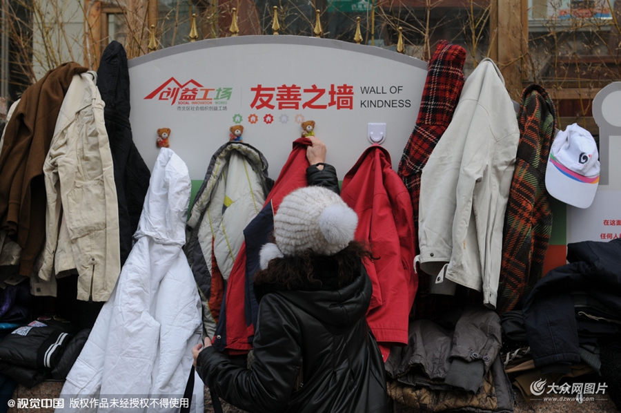 2016年1月31日,山東青島,獻愛心活動得到市民的積極響應(yīng),紛紛從家中將洗好的閑置衣物懸掛到嘉定路的“愛心墻”上供需要的人領(lǐng)取。