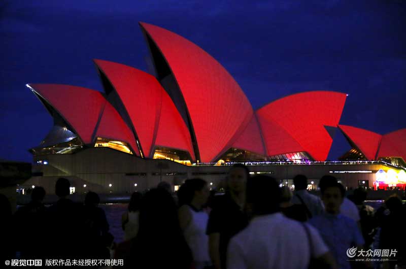 當(dāng)?shù)貢r(shí)間2016年2月6日,澳大利亞悉尼,悉尼歌劇院點(diǎn)亮紅光迎接中國(guó)農(nóng)歷新年。