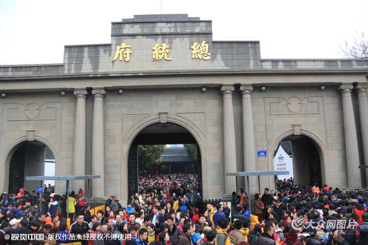 2016年02月11日,江蘇省南京市,游客在南京總統府參觀。當日,雖然天空飄起小雨,但是游客仍然爆棚,數萬人打傘冒雨參觀,現場十分裝壯觀。