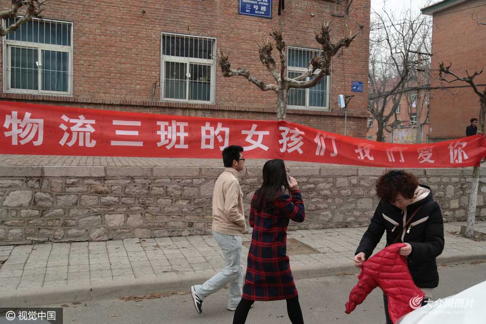 2016年3月7日,山東濟南某高校內為慶祝“三八”國際婦女節,在校園內懸掛多條條幅來慶祝這一節日來到。