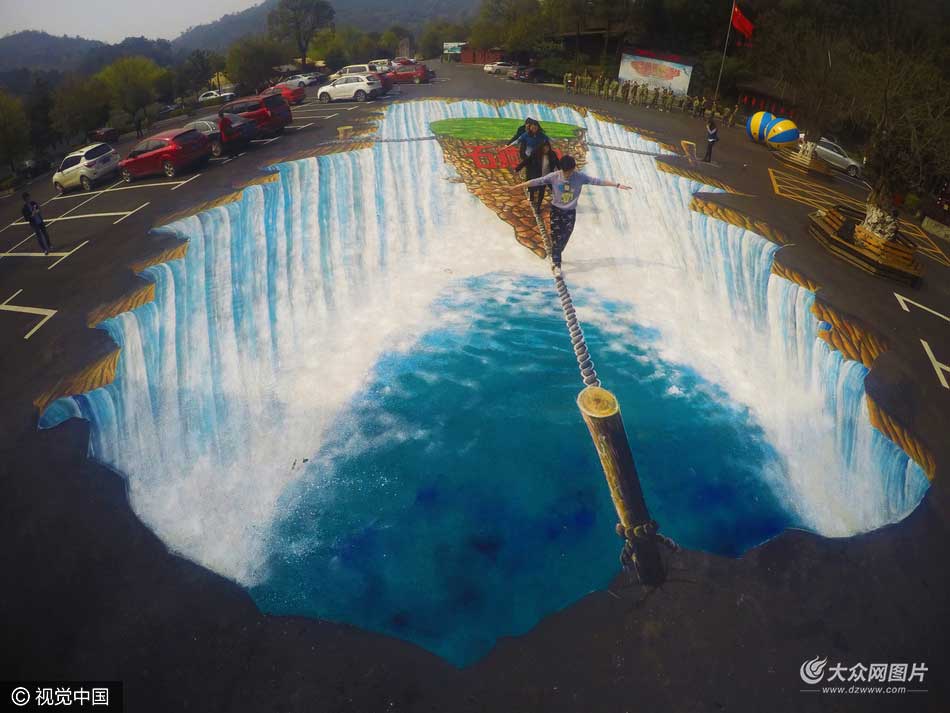 2016年3月6日,湖南長沙,一幅面積約500平方米的巨型室外3D畫作現(xiàn)身長沙石燕湖。該幅畫主題結(jié)合長沙石燕湖山水特點,并融入“懸浮山”、“繩索”、“峭壁”等多種元素,形象逼真大氣、妙趣橫生,不少游客在畫作面前大擺Pose,體驗“人畫合一”的樂趣。