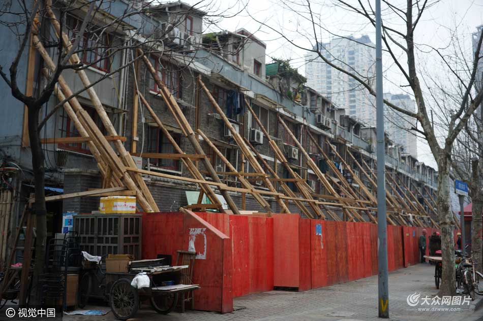 2016年3月13日,上海黃浦區,黃陂南路永年路一石庫門舊里房屋發生傾斜開裂,外墻用數十根木棒進行加固,場面十分壯觀,不少路人走過都加快了腳步。據了解,此處房屋開裂傾斜是由于相隔一條馬路的兩個建筑工地野蠻施工造成。此段居民小區為上世紀20年代建成的磚木結構石庫門建筑,房齡至今已經90余年,受影響的居民就多達幾十戶。