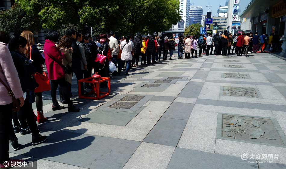 2016年03月28日,浙江省金華市,受國際金價的影響,黃金價格在短期震蕩之后就展開了下跌,已經(jīng)破位前期低點關(guān)鍵支撐,黃金價格持續(xù)走低。金華部分黃金經(jīng)營商家實時推出優(yōu)惠折扣,特別推出和猴年有關(guān)的黃金產(chǎn)品。當(dāng)?shù)蛢r優(yōu)惠來臨,不少市民果斷出手,在街頭排起了長隊購買黃金。