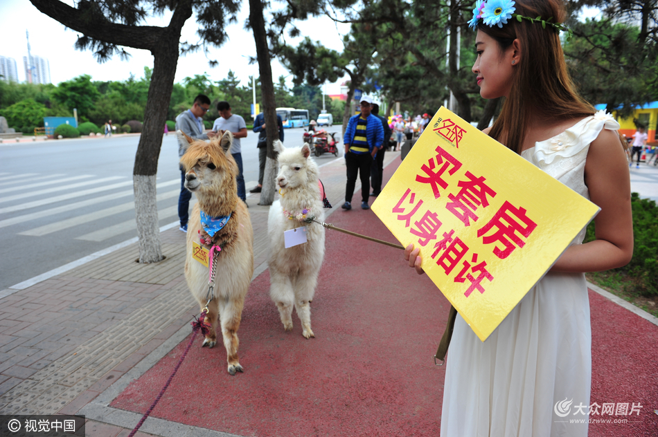 2016年6月5日,在山東省日照市海曲中路海曲公園門口,兩名美女每人牽著一頭“神獸”羊駝在路邊遛彎,并手舉“買套房以身相許”的牌子向路人展示,吸引了眾多市民圍觀拍照。