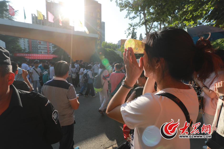 6月12日,濟南中考第二天,在山師附中考點外,高溫悶熱的天氣,不僅對考生來說是一種考驗,也讓在場外焦急等待的“陪考大軍”備受“烤驗”。圖為一考生家長用冰鎮飲料解暑降溫。大眾網記者 王長坤 攝