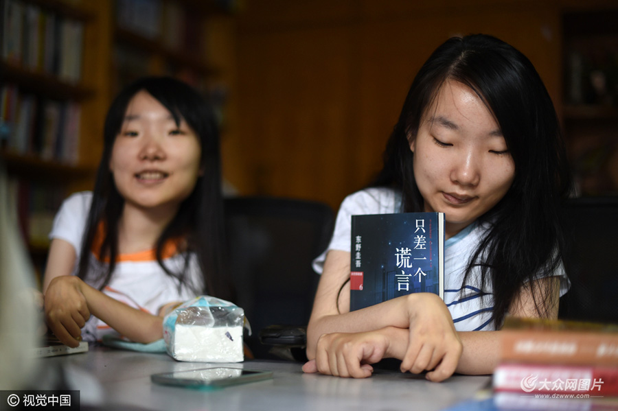 7月4日上午,記者來到了“漸凍人”姐妹趙文靜、趙雅靜的家。一進門記者就被嚇了一跳:陽臺、客廳的兩側全部被改裝成了書架,從名著傳記到穿越小說,種類、數(shù)量多得像個小圖書館,而坐在電腦前的姐妹倆似乎已經(jīng)習慣了客人的驚訝,一臉淡定。