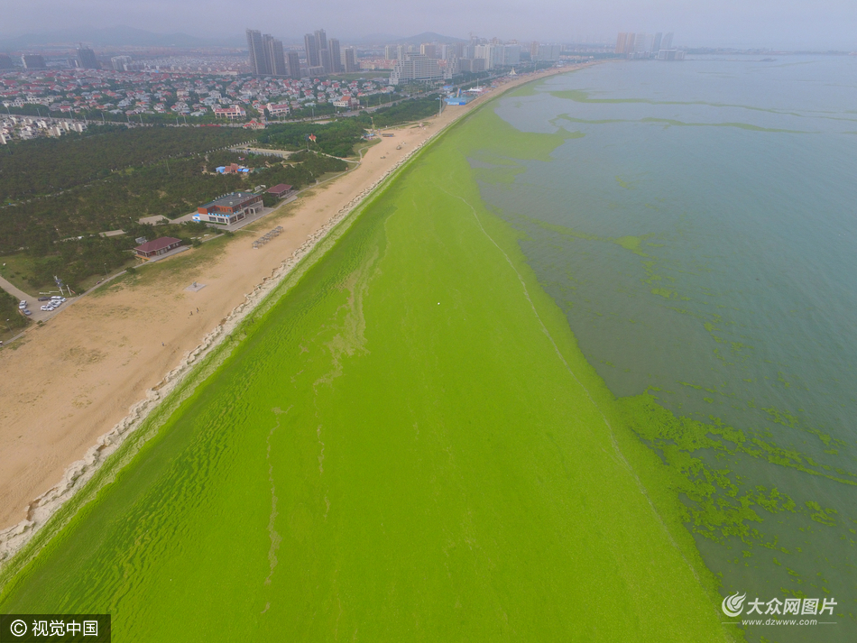 2016年07月08日,山東省煙臺市,在海陽鳳城金沙灘附近海域,大面積滸苔分布在沿海一線。