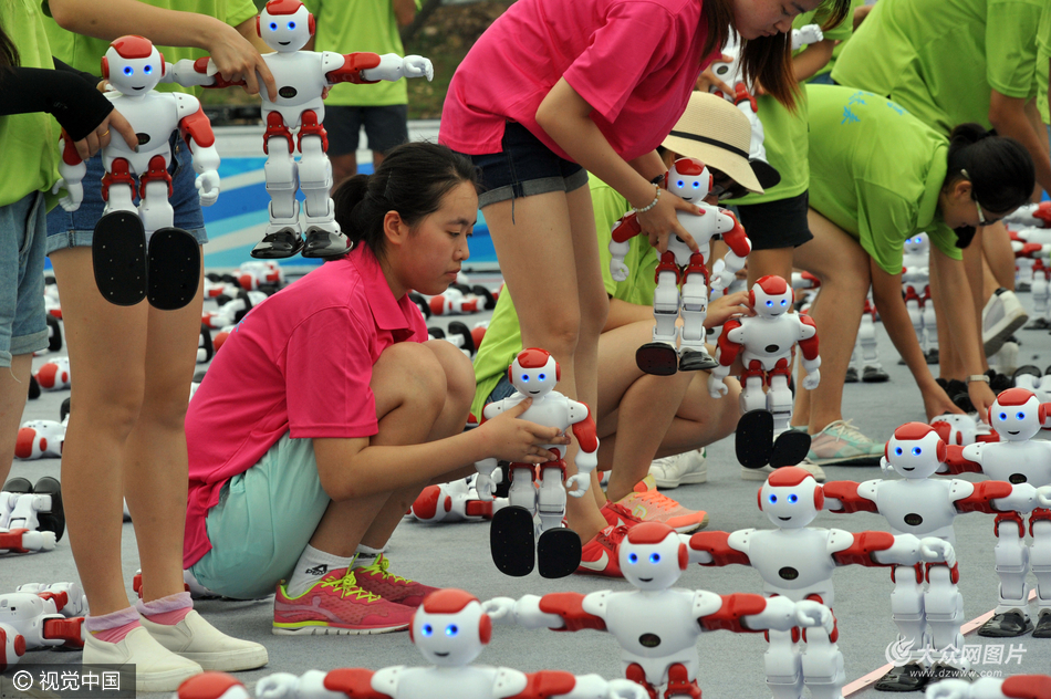 2016年7月30日,青島。青島啤酒節會場,挑戰機器人同時跳舞的吉尼斯世界記錄成功,同時有1007個機器人同時跳舞,見證官現場頒發證書。