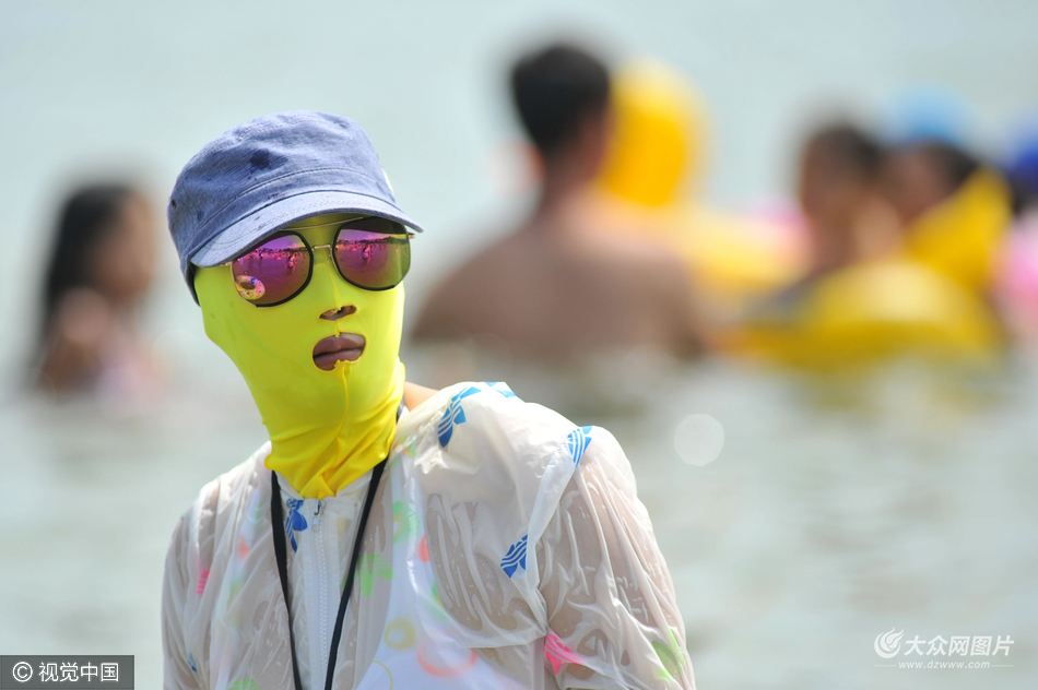 2016年8月16日,山東省青島市,高溫?zé)崂讼硌睾5貐^(qū),連日來(lái)市區(qū)最高氣溫一直維持在32℃—35℃,也是海蜇高發(fā)期季節(jié),穿帶防曬防海蜇神器的“臉基尼”大媽采取最好的防護(hù)措施,扎堆出現(xiàn)在海水浴場(chǎng),游客避之不及,更有小朋友被嚇得大哭。