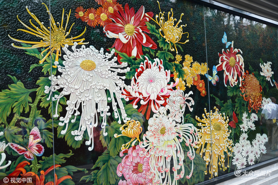 2016年9月7日訊,成都市百年名園人民公園菊園門口現浮雕漆畫百菊圖,畫長7米,高逾2米,由成都藝術家王懿創作。王懿將木版畫、烙畫、壁畫和雕漆結合起來,歷時三個月創作出該浮雕漆畫。畫面上的菊花品種有芙蓉托桂、帥旗、龍爪等,很多都是四川的特色名種。
