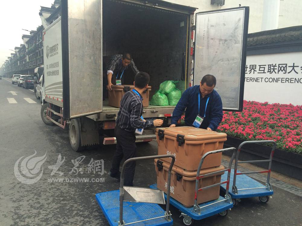 在烏鎮互聯網國際會展中心門前,大會指定餐飲供應商正在向會展中心供應膳食。大眾網特派記者 李兆輝 攝