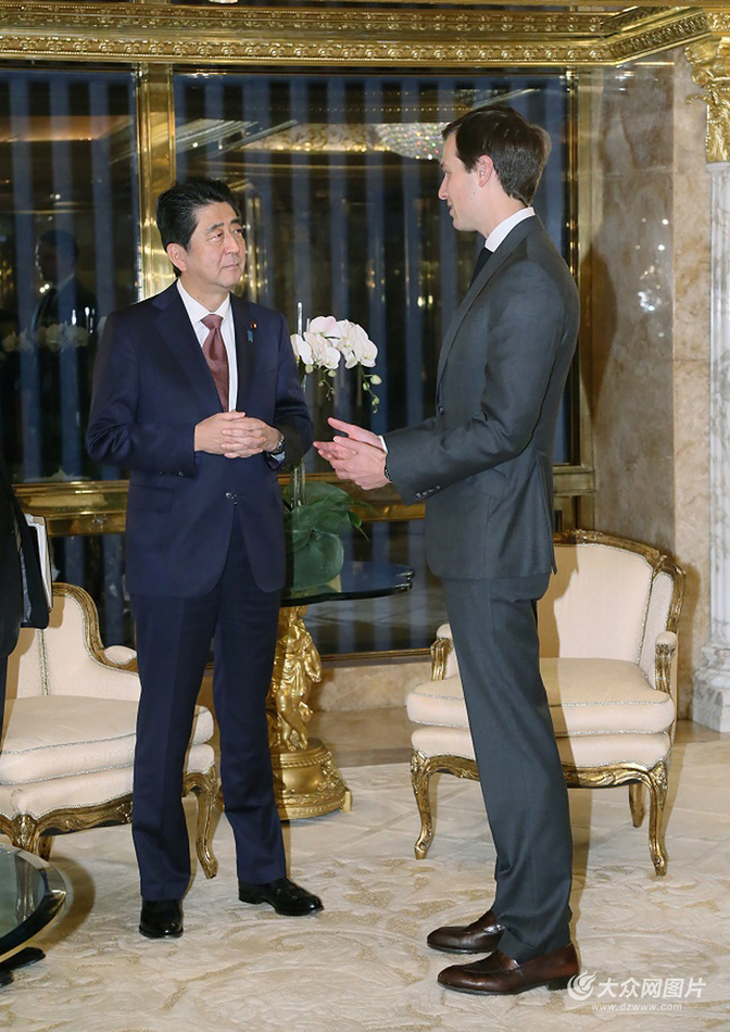 當地時間2016年11月17日,美國紐約,日本首相安倍晉三跟美國候任總統特朗普的女兒伊萬卡夫婦交談。