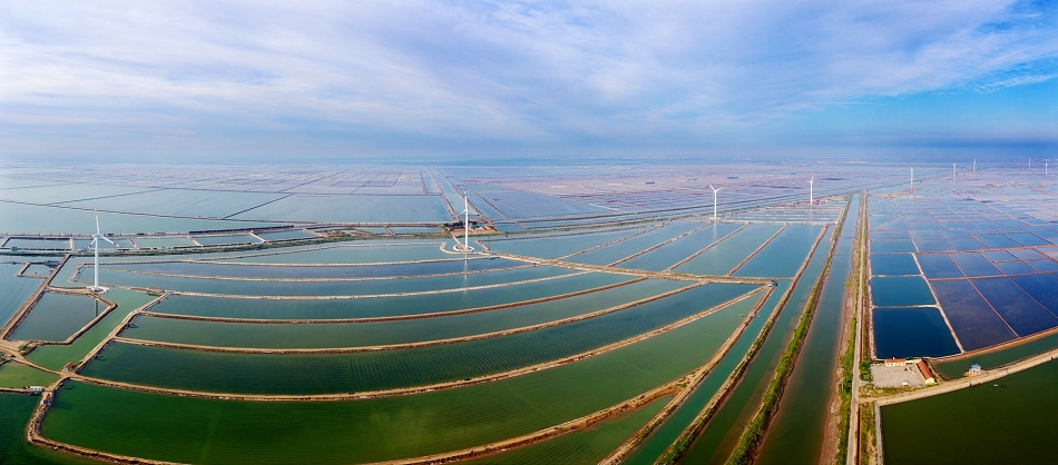 在黃河三角洲入海口的東營市沿海灘涂地帶,興建了大大小小無數(shù)個鹽場,星羅棋布的鹽池和風(fēng)車陣,形成了黃河三角洲獨特的景觀。