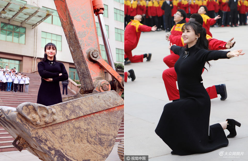 12月11日,柳巖一身露背黑長裙空降山東藍翔高級技工學校,為宣傳主演電影《大鬧天竺》豁出膽玩很high。