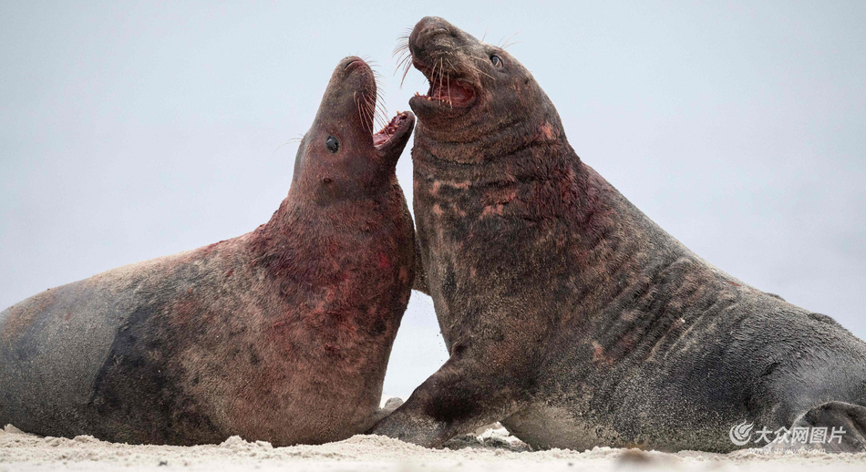 當地時間2016年12月14日,德國黑爾戈蘭島,兩只雄海豹廝打的渾身是血。隨著交配季節的到來,為了爭取交配權利,雄海豹們往往需要相互廝打競爭上崗。每年11月到來年1月都有成百上千的母海豹來這座島上產崽。海豹幼崽出生后三個禮拜,通常都會離開父母自己生活。截止當天,今年新生幼崽的數量達到創紀錄的320只。