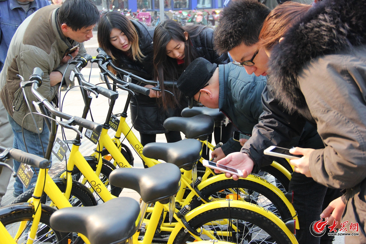1月16日,濟南泉城路段首現(xiàn)ofo共享自行車,吸引了不少市民的眼球,紛紛圍上前來。對于年齡稍微大一點的市民就不明白這個鎖怎么用了,車鎖為數(shù)字密碼鎖,掃描二維碼后系統(tǒng)會自動發(fā)送手機密碼鎖密碼,準確的撥下密碼鎖就自動打開了。實習生 孫明悅攝