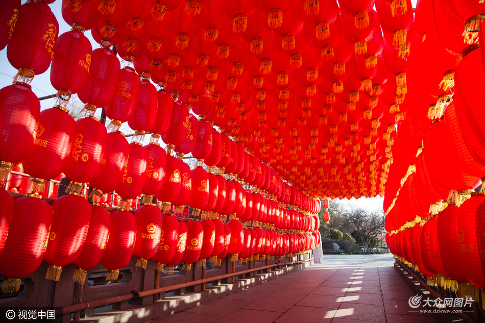 2017年01月22日,濟南,為了迎接2017新年的到來,臘月二十五一早,大明湖景區內出現一條十幾米長的燈籠陣,左右和頭頂都是小紅燈籠,紅紅火火甚是喜人,也為節日增添喜慶氣氛。