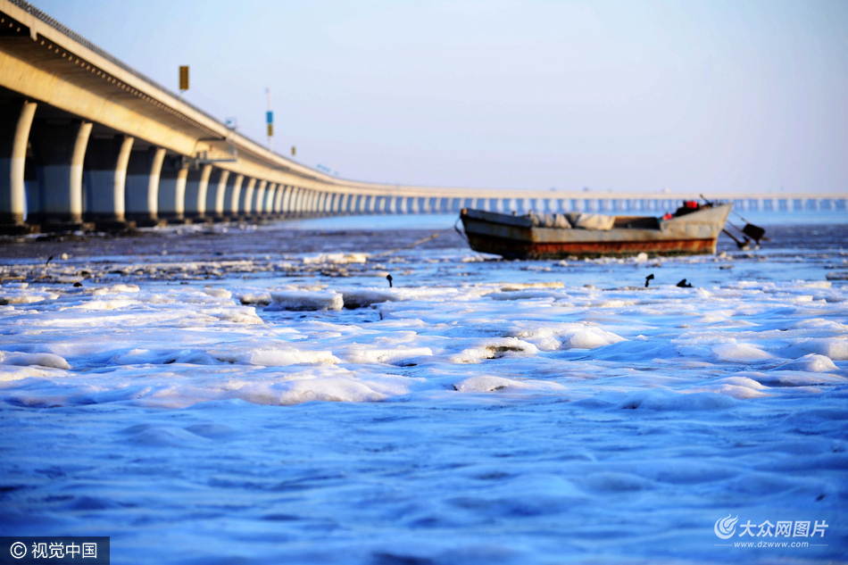 2017年1月22日,受大風降溫的影響,青島膠州灣跨海大橋兩側海域再次出現初生海冰,最厚處超過10厘米。今年海水結冰比去年晚十余天,目前未對海洋養殖和漁船作業帶來影響。