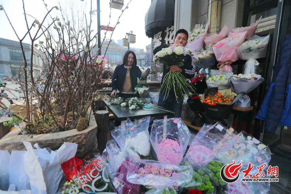 2月13日,山東濟南,在省府前街附近步行街的一家花店內,工作人員正在為即將到來的情人節準備鮮花。花店負責人告訴記者,顧客多是通過電話、微信和網絡訂花,銷售量非常可觀。大眾網記者 王長坤