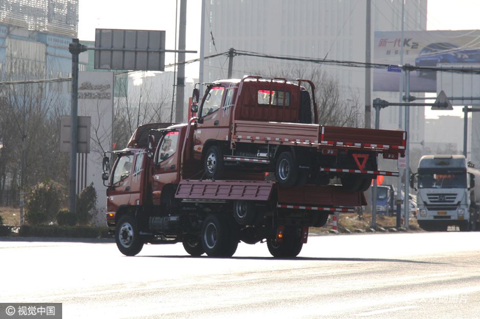 2017年2月20日,山東濱州,三輛卡車“疊羅漢”行駛在國道上。一輛七八米長貨車像疊羅漢一樣載著兩輛同一型號貨車,搖搖晃晃開過路口,高度甚至超過了大型客車。