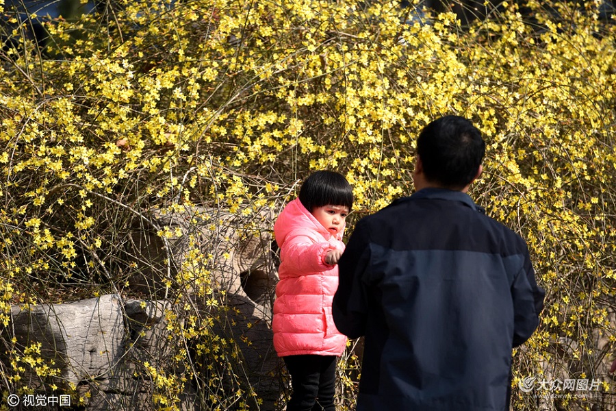 2017年02月26日,山東省濟(jì)南市,明湖畔,一簇簇迎春花迎著暖陽(yáng)已經(jīng)悄然綻放,釋放出春天的氣息。周末前來(lái)踏青賞花的市民游客紛紛掏出手機(jī)拍照。前幾日還寒風(fēng)刺骨的濟(jì)南,仿佛一轉(zhuǎn)眼就變成了溫暖的春天,有點(diǎn)讓人難以適應(yīng)。