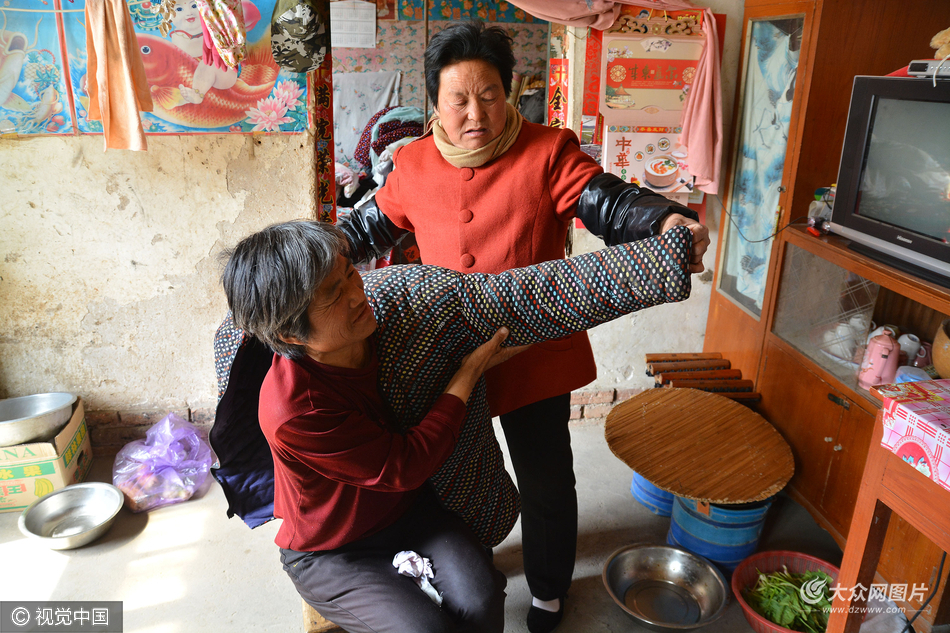 呂存珍的鄰居管仁臻(后)正在幫助她穿上衣。呂存珍說,這么多年,很多好心的鄰居和親友,以及村委一直在都幫助她,讓她很感激。這些年她是在過著“鄰居的日子”(意思是:鄰居在生產、生活中的幫助)。