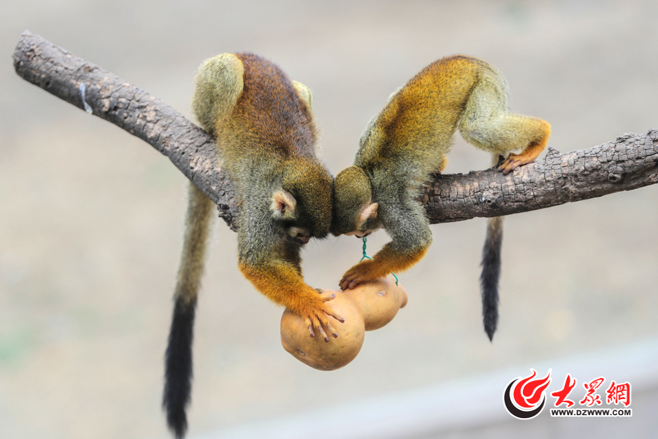 3月23日,在濟南動物園里,動物們一直過著食住無憂的生活,為了讓它們不覺得無聊,提高幸福指數(shù),園方為動物們量身定制了“豐容玩具”。圖為兩只松鼠猴在爭奪葫蘆里的美食。大眾網(wǎng)記者 王長坤 攝