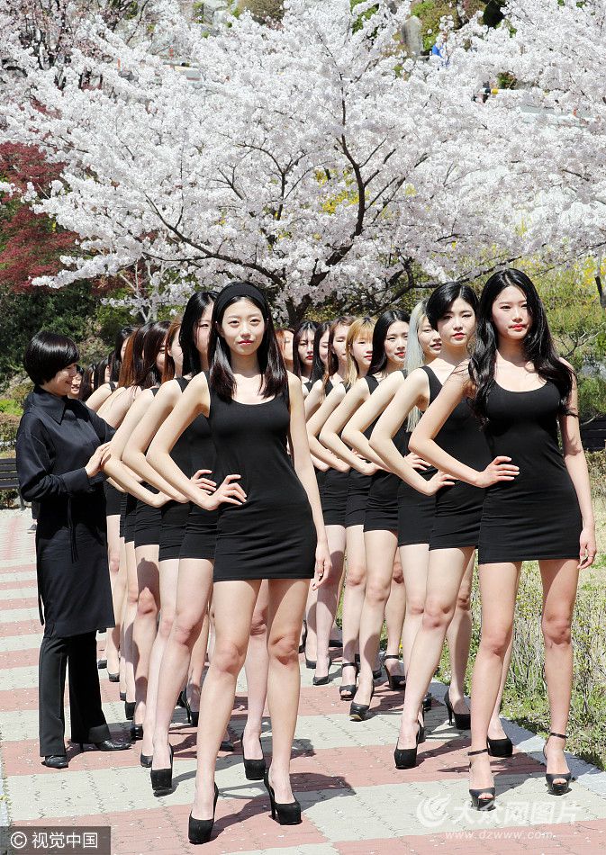 當地時間2017年4月10日,韓國大田,一大學模特專業的女學生在櫻花樹下上課,學走臺步,秀出姣好身材和大長腿。