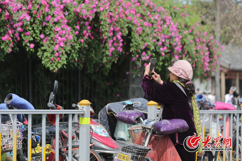 4月20日,濟南趵突泉公園外,薔薇花綴滿枝頭,搖曳多姿,吸引了眾多游客觀賞,給泉城增添了勃勃生機,成一抹靚景。圖為市民在路邊拍攝薔薇花。大眾網記者 王長坤 攝