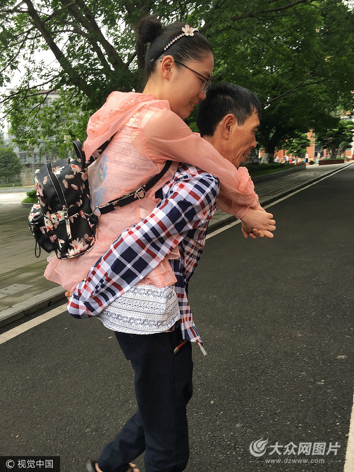2017年6月9日,四川瀘州,黃歡在媽媽的陪同下結(jié)束了口語測試。在考場與宿舍間走動時,50多歲的父親將雙腿高位截肢的黃歡背在背上,母親則提著凳子走在一旁。