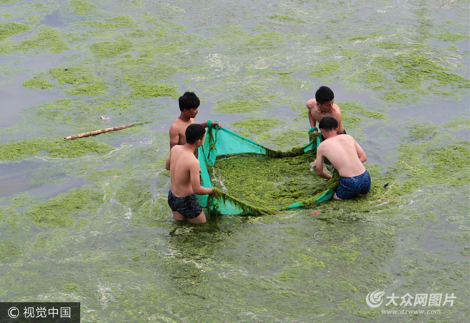 2017年6月25日,青島,受風向和海水溫度升高的影響,大面積的滸苔再次入侵青島沿海一帶,瞬間讓沙灘變草原,直接影響了到青島的觀光旅游業。為消除滸苔對青島觀光旅游業的影響,青島一家旅游公司10多名員工不用上班,每天在棧橋附近打撈滸苔40多噸。據這家公司老板介紹,每年滸苔入侵青島的時候他都會帶領員工義務打撈,并堅持了10年。而且公司老板謝絕采訪,稱打撈滸苔純屬是一種義務勞動,為青島的旅游觀光業做一份貢獻。